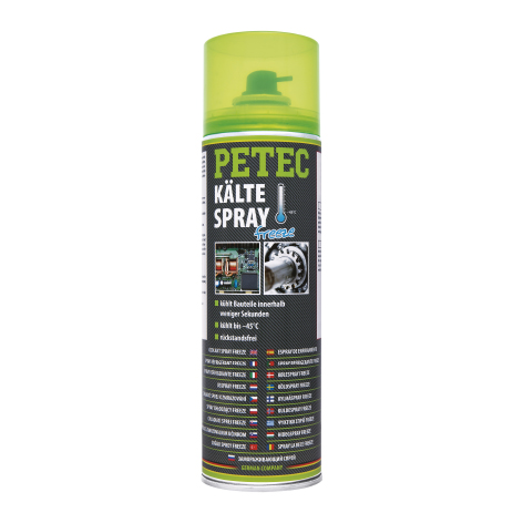 PETEC Kältespray zur Fehlersuche in elektronischen Bereichen sowie zum Abkühlen von Konstruktionsteilen, wie z. B. Lager, Wellen, Buchsen, Passfedern, Kettenglieder, Vergaser- und Einspritzanlagen, Transistoren, Widerstände und sonstige Teile mit engsten Passungen. Auch zum Abkühlen von stark erwärmten Teilen einsetzbar.
